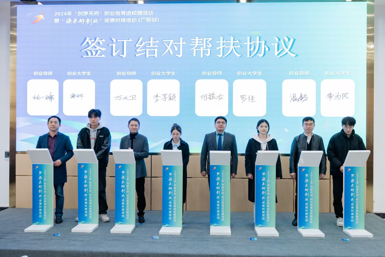 在启动仪式上,万大卫等八位创业导师被聘为广安市创业导师,并与广安职业技术公司创业学子签订了结对子帮扶协议。